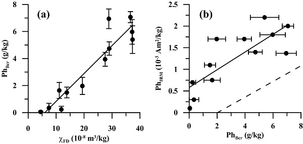 图2(a)成土赤铁矿含量指标与成土亚铁磁性矿物之间的对比关系,正的X轴截距代表前者生成的滞后;(b)成土赤铁矿的含量指标与成土赤铁矿剩磁指标的对比,虚线指示初始生成大量SP颗粒的情况