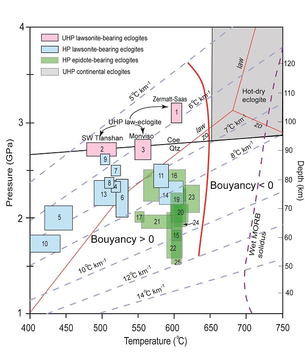 洋壳的成分主要为MORB,它俯冲到深部地幔会转变为蓝片岩和榴辉岩。大量的高温高压实验研究表明,洋壳榴辉岩的密度大于周围地幔,因而它很难通过自身浮力而折返到地表。然而,自然界大洋俯冲带中出露了大量的洋壳榴辉岩,表明至少有部分的洋壳与俯冲板块拆离而折返至地表。近三十年来,众多研究学者认为洋壳榴辉岩的折返必须借助于其它低密度岩石,如地幔楔蛇纹岩或增生楔变沉积岩。然而,深俯冲洋壳的折返机制仍不明确,根源在于对俯冲洋壳自身在浅部地幔的密度演化仍缺乏系统的认知。