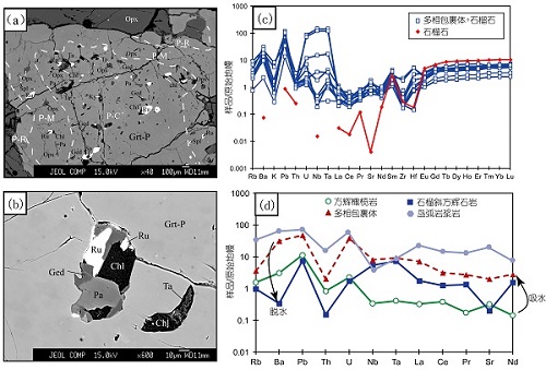 图2 (a-b)石榴石变斑晶核部包裹的大量多相含水矿物包裹体;(c)多相包裹体和寄主石榴石的微量元素特征;(d)多相包裹体与原岩方辉橄榄岩和全岩石榴斜方辉石岩的微量元素对比。