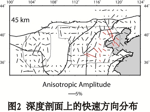 800彩票地球深部结构与过程研究室地震学学科组王建副研究员等人利用区域地震的P波震相数据进行各向异性层析成像研究,获得了华北克拉通地区的地壳及上地幔顶部的速度结构及各向异性分布。有深度分辨率各向异性结构的探讨对华北克拉通的破坏提出了新的研究思路。研究发现华北克拉通东部及中部地区下地壳及上地幔顶部低速异常广泛分布,且大地震的震源位置与速度结构存在着关联(图1);同时研究发现在华北东部部分地区的上地幔顶部存在着北西-南东向快速方向(图2),其与绝对板块速度方向总体上一致,可能表现出了新生代岩石圈地幔的各向异性特征。