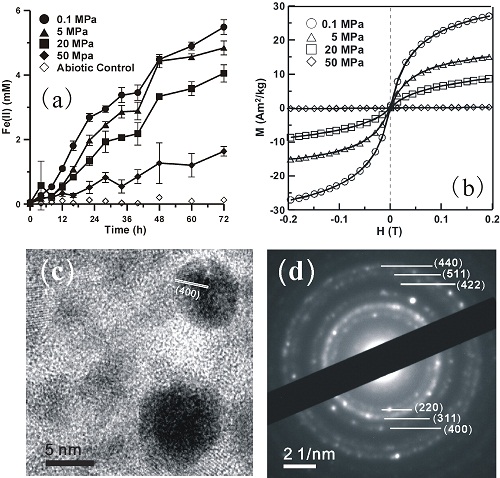 (a)WP3在0.1-50 MPa(相当于0-5000 m 水深)范围内均可以还原Fe(III) ,还原速率随压力升高而减慢;(b)4个压力下的矿化产物室温磁滞回线均呈S型,为超顺磁颗粒,且饱和磁化强度随压力升高而减小,反映了高压下WP3矿化速率减慢;(c)和(d)高分辨透射电镜、选区电子衍射结果显示50 MPa下矿化产物为结晶的纳米级磁铁矿。随着压力的增加,磁铁矿粒度增大和结晶度增强。