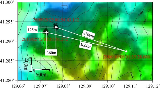 朝鲜核试验场的地表地形图。黑色曲线为等高线,白点为3次核爆的位置,相对距离标注在图中。