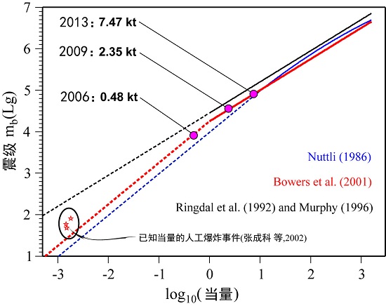 利用经验的震级-当量关系曲线估算2013年朝鲜核爆的当量。