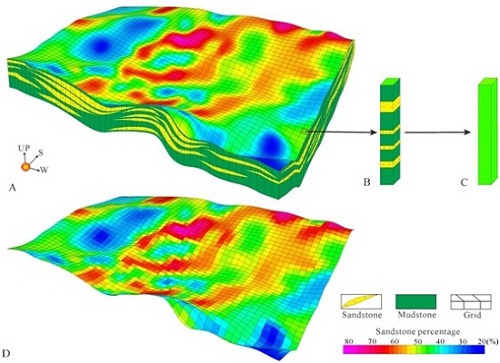 图1 由网格划分的单元柱组成的砂岩体分布模型(A)及用砂地比表征的二维输导层模型
