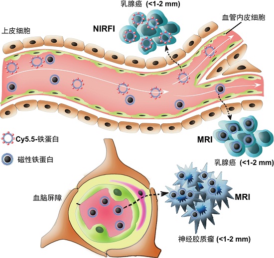 1  能跨越体内屏障和诊断微小肿瘤的核磁共振成像和近红外荧光成像造影剂工作原理示意图