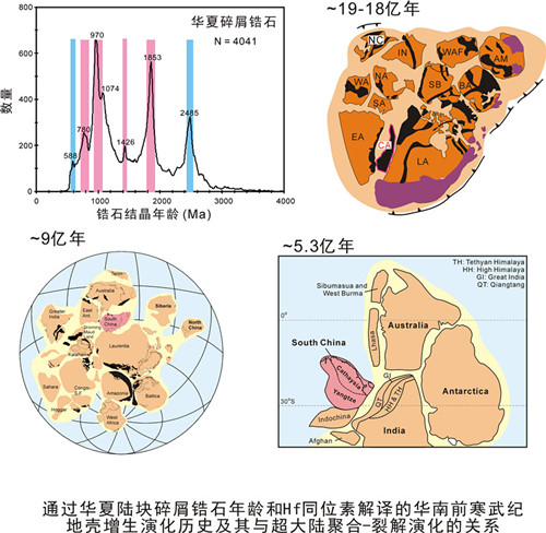 华夏陆块的前寒武纪地壳演化与全球超大陆聚合-裂解密切相关。通过碎屑锆石年龄谱图特征和其他地质记录的对比发现,在~19亿年前 Columbia/Nuna超级大陆聚合期间,华夏陆块最初和可能是介于东南极-劳伦和澳大利亚三个大陆之间的造山带(图一)。在~10-8.9亿年前Rodinia超大陆聚合时,华夏与扬子陆块通过四堡造山带聚合形成了统一的华南大陆。华南大陆联接劳伦-澳大利亚-东南极之间,位于Rodinia超大陆的“核心”。新元古代晚期,华南很可能通过“泛非期”碰撞造山带与印度相连,成为冈瓦纳大陆的一部分。
