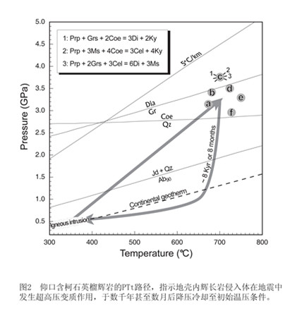 杨建军研究员等人经过分析研究,指出粒间柯石英产于仰口榴辉岩角砾岩(图1),并且仅出现在角砾而非胶结物中,胶结物所含约20%的多硅白云母以及它在地震时局部脱水熔融后快速结晶的钾长石+石英+钠长石组合表明岩石并非绝对无水。另一方面,角砾中也含有少量多硅白云母,并且在超高压变质条件下胶结物内的水流体在极短的时间内就可以扩散到角砾中,因此在漫长的深俯冲和折返过程中很难保持绝对无水。计算表明,只有符合岩石在数千年甚至数月内从超高压条件降压冷却到柯石英停止向石英转变的正常地壳条件(<400 °C),角砾中的粒间柯石英才能得以保存,钠长石也才能得以从地震熔体中结晶(图2)。因此,仰口榴辉岩角砾岩及其中的粒间柯石英所记录的是一次同地震(瞬时)高压变质事件,不应被视为深俯冲的产物。