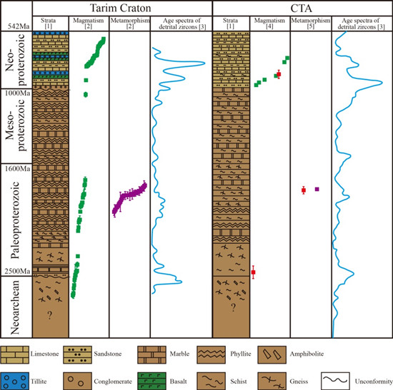 800彩票固体矿产资源研究室博士生王信水和导师高俊研究员等人在中天山南缘蛇绿混杂岩带考察中发现了高级变质岩块,经过详细的野外地质填图,确定了代表中天山地块前寒武纪基底的乌瓦门变质杂岩的分布范围和岩石组成(图1),并对中天山地块的基底组成和属性进行了详细的年代学和地球化学研究。其中,就黑云母斜长角闪片麻岩和侵入其中的浅色花岗岩脉研究获得如下认识:(1)中天山地块具有晚太古代至早元古代的结晶基底;(2)中天山地块经历~2.5Ga的全球大陆生长事件,~1.8Ga的Columbia超大陆聚合事件以及~785Ma的Rodinia超大陆裂解事件;(3)通过地层,岩浆-变质作用和碎屑锆石年龄谱图的对比研究,前寒武纪期间中天山地块是塔里木克拉通的组成部分(图2)。