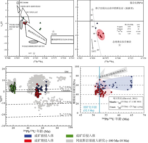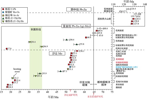 (1) 结合野外岩相的详细划分,确定沙让钼矿成矿前石英二长岩-石英闪长岩(56-53Ma)、成矿期花岗岩-花岗斑岩-似斑状花岗岩-细粒花岗斑岩(53-51Ma)和成矿后花岗闪长斑岩-英安斑岩-煌斑岩(22-18Ma)三期岩浆作用;不同产状的辉钼矿Re-Os等时线年龄为52.3 Ma;与成矿有关的绢云母化发生在51.1 Ma(Ar-Ar法);联合确定其形成与印亚大陆碰撞的主碰撞阶段有关。