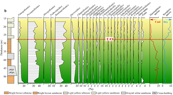 新生代以来地球上最为显著的的气候变化之一就是发生在距今3400万年前,始新世(Eocene)/渐新世(Oligocene)界线的降温事件。它表现为地球气候从此前的温湿期(Green House)快速转变为冰室期(Ice House),并在南极开始出现冰盖(即南极冰盖),同时伴随全球气温的显著下降。目前对始新世-渐新世(E/O)界线古气候变冷事件的研究主要来自深海钻探与大洋钻探所获取的深海岩芯,而来自陆地的E/O事件记录相对较少。该气候降温事件发生时的生物圈响应,无疑是地球圈层相互作用的研究范例。