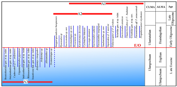 图2 晚始新世时期以大型奇蹄类为主的哺乳动物转变为早渐新世以啮齿类、兔形类为主的小型哺乳动物群