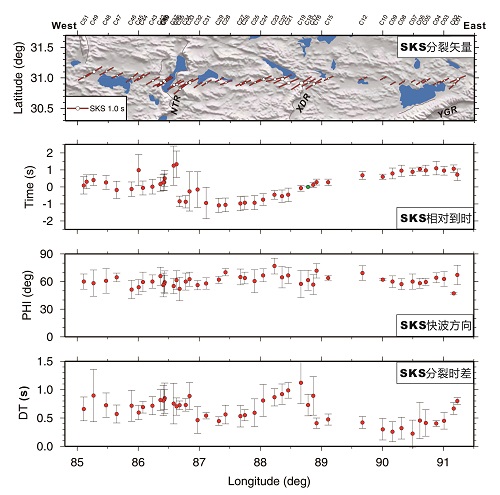 800彩票特提斯研究中心陈赟副研究员及合作者基于TIBET-31N台站资料,在有针对性地提高横向分辨和减小测量误差的前提下,开展了震相-方位-震中距优选、多种方法联合等分析处理工作,获得了沿剖面SKS到时和横波分裂参数的细节变化特征。研究结果表明,SKS到时和横波分裂参数的东西向变化呈现出与地表南-北向裂谷分布高度相关的分段性:自东向西,东段(申扎-定结裂谷以东),SKS到时最晚,横波分裂时差最小(约0.2s);中段(申扎-定结裂谷以西,尼玛-定日裂谷以东地区),SKS到时最早,横波分裂时差中等(约0.5s);西段(尼玛-定日裂谷以西),SKS到时较晚,分裂时差最大(约0.7s)。
