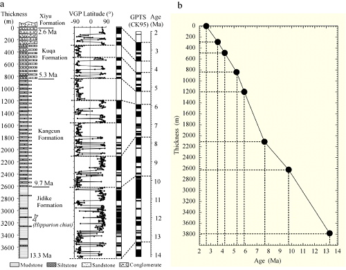 1)获得可靠的时间标尺是解析构造事件与古气候演化的基础,他们基于古生物地层学和磁性地层学建立的时间标尺为13.3 Ma-2.6Ma (2。在剖面下部,发现贾氏三趾马右下臼齿化石(M3)一枚,属于灞河期三趾马,年龄为9-11Ma。地球上,三趾马最早在中中新世温暖期的17-15Ma出现在美洲大陆,但到达亚洲的时间不早于11Ma(在晚新生代气候进一步变冷后,在冬季,通过白令陆桥迁徙到欧亚大陆)。在此基础上经过古地磁年代学对比,保证了所获得的时间标尺的可靠性;