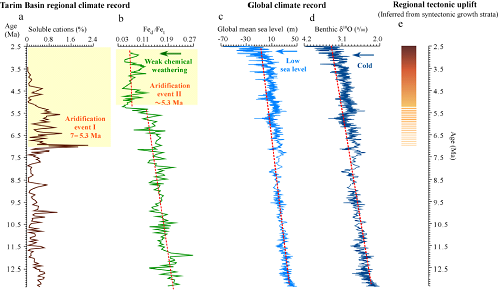 3 塔里木盆地气候记录(a, b)与全球气候(c,d)和区域构造事件(e)的对比