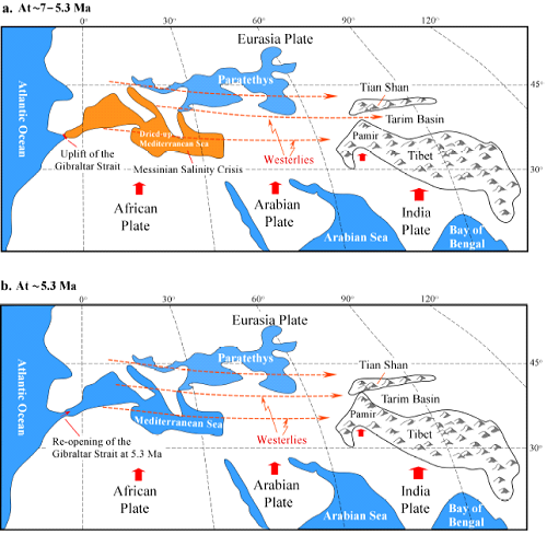 3)对于中新世末期的两次气候干旱加剧事件,他们从构造-气候耦合的角度,提出了新的解释:7-5.3Ma 的气候事件,与著名地中海盐度危机(“Messinian Salinity Crisis密切相关。受非洲板块与欧亚板块汇聚的影响,直布罗陀海峡发生构造抬升,阻断了地中海与大西洋的联系,导致地中海干涸、沉积了数千米的蒸发岩,导致地中海盐度危机的爆发。受其影响,通过西风带向塔里木盆地输送的水分减少,导致下风方向塔里木盆地的干旱化,由于帕米尔与南天山之间尚有狭窄的水汽通道,有限的水汽仍能输送至塔里木盆地(图4a),但在5.3 Ma之后,虽然海水重新注入地中海,此时却受印度板块与欧亚板块碰撞的持续影响,帕米尔已经与南天山碰撞,水汽通道关闭(图4b),来自大西洋的水汽被阻隔,加剧了塔里木盆地的急剧干旱,并最终形成了塔克拉玛干沙漠。