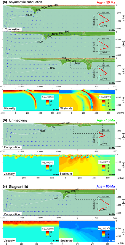 图1 不同岩石圈热年龄所对应的三种动力学端元模式:稳定盖层、局部缩短和非对称俯冲