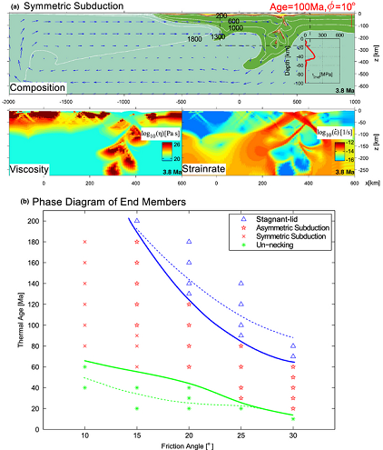 图2 (a) 低强度岩石圈所对应的第四种动力学端元模式-对称俯冲 (b)四种动力学端元模式的参数空间相图