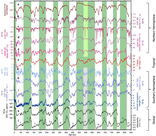 (a) 亚洲冬季风的复合粒度(>32 μm)记录;(b) ODP 980孔底栖有孔虫δ13C记录;(c)“冰筏碎屑带”内IOPD U1308孔Si/Sr比值;(d)和(e)DSDP 607 孔碳酸盐含量和冬季海表温度;(f) 热带海表温度复合记录;(g)−(j) 来自南半球的记录;(g) ODP 1123 孔根据Mg/Ca比值计算的大洋底流水温;(h)和(i) ODP 1090孔底栖有孔虫δ13C和风尘铁通量变化;(j) EPICA冰心记录的气温变化;(k) 冰心记录的大气CO2记录;(l) 底栖有孔虫δ18O复合记录LR04