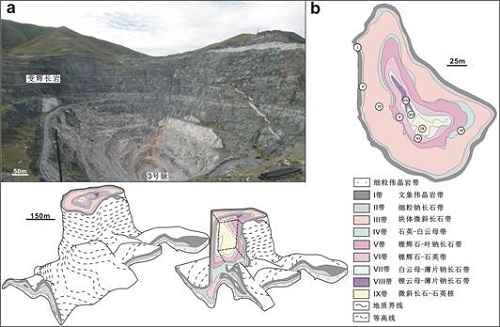 图1 可可托海3号脉采坑照片及内部结构分带图