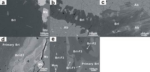 a,边缘带中均一绿柱石晶体; b,II带细粒钠长石和似筛状绿柱石;c,II带中具有平直振荡蚀变边的绿柱石;d,III带产出的原生绿柱石及其不规则振荡蚀变边(Brl-E1);e,VI带中原生绿柱石与具有不同Na和Cs含量的不规则蚀变边(Brl-F1,F2,F3)。Brl,绿柱石;Ab,钠长石;Qz,石英;Ms,白云母