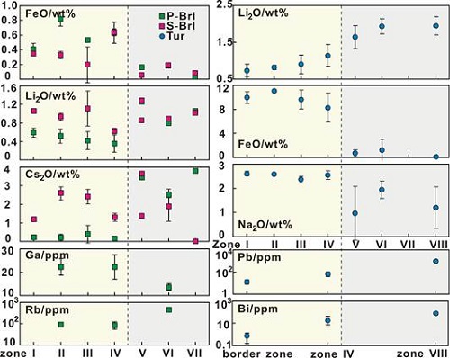 图3 可可托海3号脉外部带(I-IV带)与内部带(V-VIII带)中绿柱石和电气石的成分差异