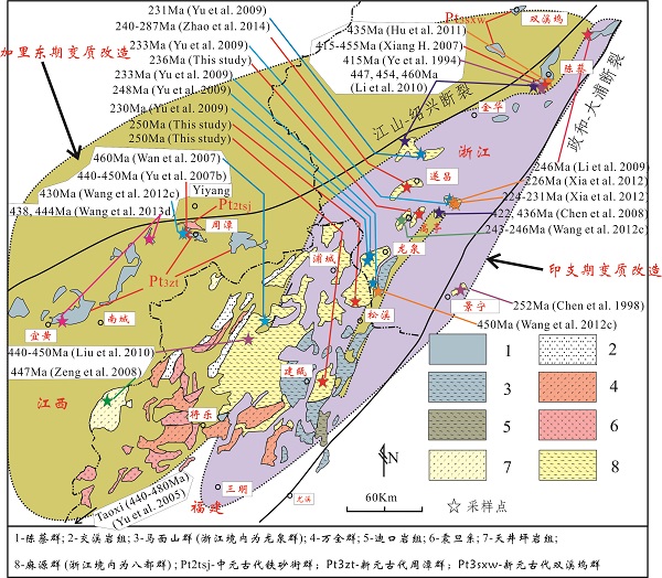 图1 华夏陆块东北部古老基底岩系以及显生宙两期构造热事件的影响范围