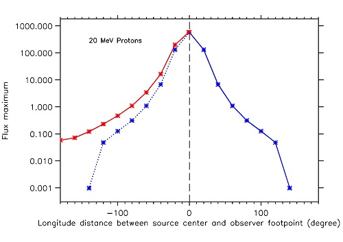 图2:源自日面不同经度位置的太阳高能粒子事件在地球附近的峰值通量,呈现系统性的东(左侧红线)-西(右侧蓝线)“相对经度”非对称分布现象