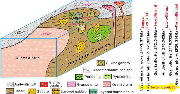 图1:纸房地区蛇绿混杂岩和碰撞火成岩时空关系结构模型图