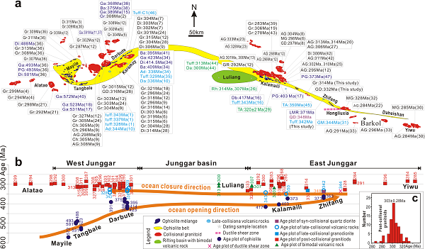 中亚造山带是地球上最大的增生造山带,形成于古亚洲洋的俯冲、岛弧与微陆块的拼贴。古亚洲洋的演化与闭合时间是中亚造山带研究的关键科学问题之一。以玛依勒-唐巴勒-达拉布特-卡拉麦里-纸房-大黑山蛇(MTDKZD)绿岩带为代表的准噶尔洋是古亚洲洋的一个重要组成与分支,是了解古亚洲洋的演化与闭合时间的重要窗口。然而,目前对于准噶尔洋演化与闭合时间存在严重的分歧。例如,准噶尔洋的闭合时间有早泥盆世之前、早石炭世、中石炭世、晚石炭世、早二叠之前与晚二叠之前等不同认识。出现准噶尔洋闭合时间争论的主要原因是缺乏谢米斯台-野马泉弧、MTDKZD绿岩带与准噶尔地块间碰撞时间的精确定年与约束。
