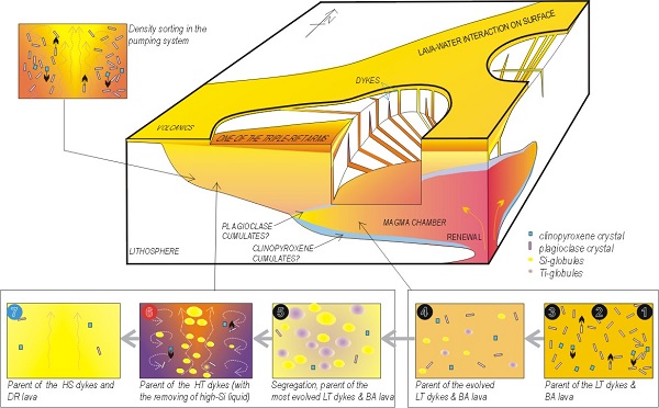 此外,通过对最接近母岩浆成分的岩墙中的斜长石斑晶中的熔体包裹体研究表明,这些熔体包裹体成分可以代表母岩浆成分,其SiO2(52 wt%)、MgO(8.1 wt.%)、TiO2(1.1 wt%)和Mg值(66)接近原始岩浆成分。该成分Si含量较高,这可能是相关岩浆岩平均成分SiO2含量较高的原因。通过对结晶分异过程的解译,结合对氧逸度等的揭示,发现中下地壳层次重力驱动下的斜长石-单斜辉石(斜长石>单斜辉石)为主的分离结晶作用造成岩浆成分的分异(并最终形成玄武岩-安山岩为主的火山岩),导致岩浆的成分富Ti-Fe而贫Ca,使岩浆发生不混熔分离。