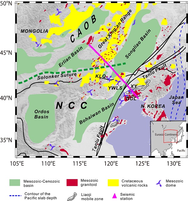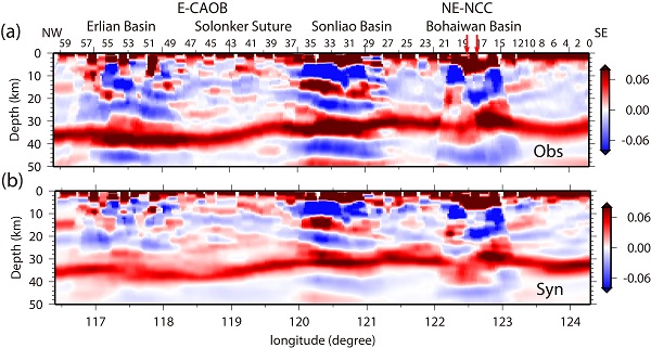 800彩票郑天愉研究员及其合作者以此构造作用为对象,进行了地壳结构探测研究,获得了探测区域地壳更新的新认识。她们以获取高质量、高分辨的地震观测资料为起点,进行了丹东-东乌珠穆沁旗约920km剖面60个流动台阵的天然地震观测(图1粉红色三角表示台站);采用新发展的接收函数成像技术,以理论转换波深度叠加剖面与观测剖面的拟合为判据(图2),构建了剖面下方地壳的剪切波速度结构(图3);进而将岩石地球化学分析对地壳岩石组分与年龄的研究结果和地质学对伸展构造的观测结果相结合,推断出辽东地区观测剖面下方的地壳是被岩浆和变质作用更新的地壳(图4)。该地震观测剖面西段位于中亚造山带,成像结果发现在Solonker缝合带下方是被向南的低角度倾斜界面分割成上下叠置的两部分(图3)。分析认为这是古亚洲洋闭合的残留构造记录。对比剖面东-西段截然不同的结构特征,她们推断,东亚大陆腹部没有受到古太平洋板块构造作用的显著影响。