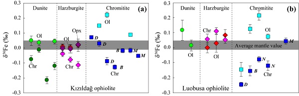 图2:Kızıldağ与罗布莎蛇绿岩中的斜方辉石、橄榄石和铬铁矿的Fe同位素对比