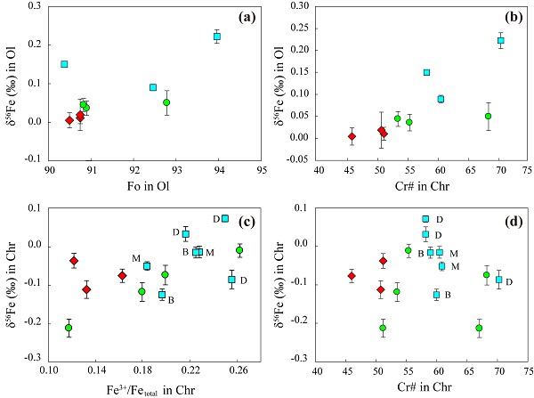 图3:Kızıldağ蛇绿岩中矿物的Fe同位素与Fo、Cr#和Fe3+/Fetotal的相关性图解
