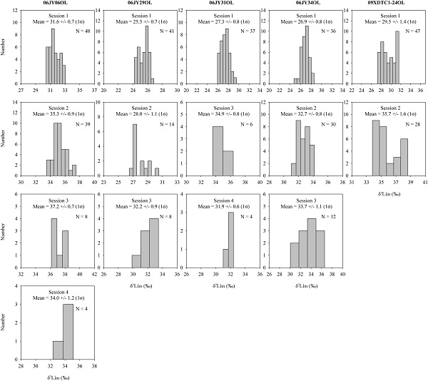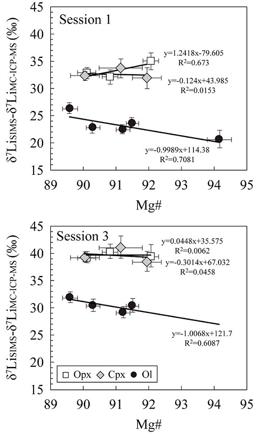 中科院800彩票苏本勋副研究员在离子探针实验室与法国合作方一起针对地幔Li同位素组成及高温下Li同位素地球化学行为等科学问题,开展了标样研制工作。经过5年的研究,在进行了大量电子探针分析的基础上,对一批斜方辉石、单斜辉石和橄榄石样品进行了详细的离子探针分析,其中有3个斜方辉石、3个单斜辉石和5个橄榄石样品具有均一的Li同位素组成,每个样品的δ7Li测试值均在3‰~5‰的变化范围内(图1)。与此同时,法国合作者也在其实验室进行了Li同位素均一性检验,得到了相同的结果。因此,这些样品可以作为Li同位素标样。同时他们的研究结果揭示了橄榄石的Mg#值对Li同位素测试基体效应为1‰(图2)。这些标样的成功研发将对Li同位素地球化学及地质过程示踪研究起到极大的推动作用。