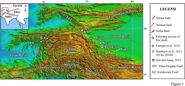 对于亚洲而言,新生代最为显著的宏观地貌演变就是青藏高原的隆起和新特提斯海的关闭。塔里木盆地紧邻西构造结的帕米尔高原,虽然现今的塔里木盆地为极端干旱的“死亡之海”¾塔克拉玛干沙漠占据,帕米尔高原构成了分割塔吉克与塔里木盆地的地貌屏障,但在新生代早期,帕米尔与南天山之间在南北方向上至少存在300-400 km的空间距离。来自新特提斯洋的海水自西端进入塔里木盆地,塔吉克与塔里木盆地不仅相通,而且二者与“土伦海”一齐构成了新特提斯洋最东端的陆缘海。长期以来,对于新生代塔里木盆地海水的退出时间以及存在多大范围的海水通道一直争议颇大,甚至有的学者认为塔里木的海水直至中新世中期才退出。不同的观点对西构造结构造演化和新特提斯海退却历史的深入认识构成了严重的阻碍。因此,塔里木盆地海水退出时间、过程、机制的研究对于深入了解板块尺度构造运动以及新生代全球尺度海面变动具有重要的科学意义。