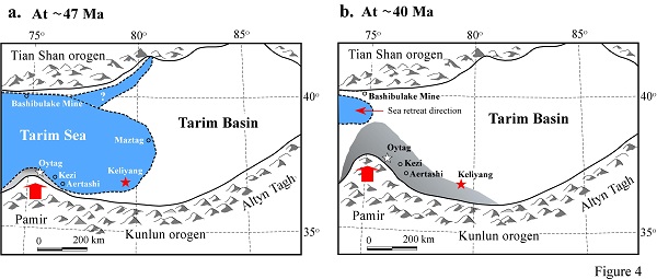 在上述工作的基础上,结合他们此前在帕米尔东北缘奥依塔克剖面的工作以及国外同行的最新研究,他们提出塔里木盆地的海水退出时间在空间上存在“穿时”的特点(图4)。在帕米尔东北缘的奥依塔克,由于受帕米尔弧形构造向北“楔入”的影响,在47 Ma即开始海退;但此时,在塔里木盆地的很多地点仍有海相沉积,直至40 Ma左右,海水才完全退出塔里木盆地。在动力机制上,由于塔里木的最后海退时间为40 Ma,这显然要早于渐新世初期(34 Ma)由于南极冰盖形成引起的全球尺度海面下降,因此,他们提出新生代印度板块与欧亚板块的碰撞导致的帕米尔高原的向北“突刺”是海水退出塔里木盆地的主要因素,全球变冷导致的海面下降仅仅是次要因素。