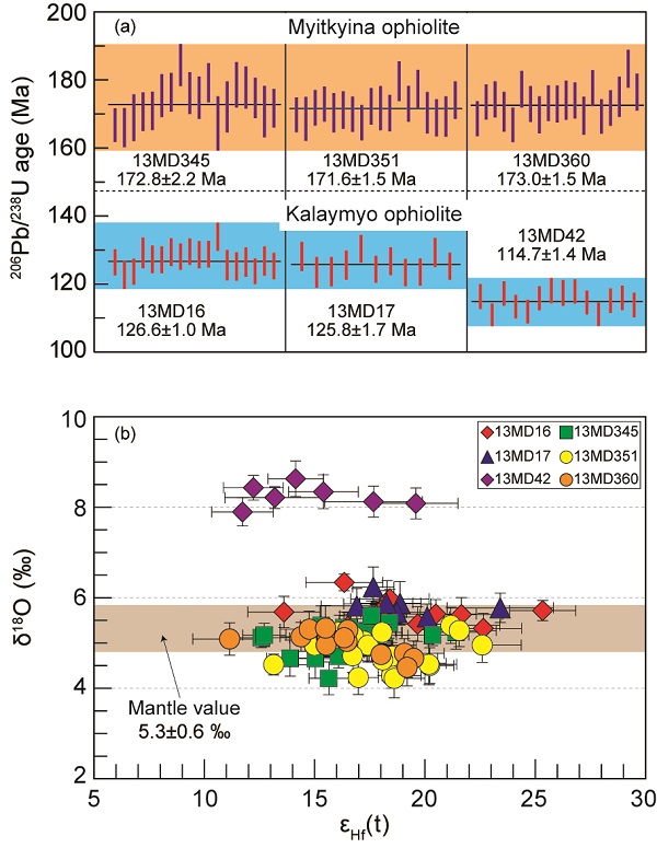 为正确厘清缅甸不同蛇绿岩带之间的关系及其与青藏高原蛇绿岩带的连接,800彩票岩石圈演化研究室刘传周研究员及其合作者对雅鲁藏布江蛇绿岩和缅甸蛇绿岩开展了系统的年代学研究。首先通过对罗布莎蛇绿岩中的辉长岩与角闪岩进行年代学研究,重新厘定了该蛇绿岩形成于早白垩世(~ 130 Ma)而非中侏罗世(Zhang et al., Lithos, 2016, 245: 93-108)。其次,对缅甸境内吉灵庙蛇绿岩采集的异剥钙榴岩和斜长角闪岩、密支那蛇绿岩采集的斜长花岗岩样品进行了系统的岩石学与地球化学分析,在此基础上开展了锆石SIMS U-Pb定年及Hf-O同位素研究(图2)。结果表明,缅甸东段的密支那蛇绿岩形成于中侏罗世(~171-173 Ma),而西段的吉灵庙蛇绿岩形成于早白垩世(大约125 Ma)。总结前人已经发表的班公湖-怒江蛇绿岩带与雅鲁藏布江蛇绿岩的年代学资料,揭示出缅甸东段的密支那蛇绿岩与班公湖-怒江带形成时代吻合,而西段的吉灵庙蛇绿岩则与雅鲁藏布江带具有一致的年龄(图3)。因此,他们提出缅甸东、西蛇绿岩带隶属于两条时代不同的缝合带,分别代表了班公湖-怒江带和雅鲁藏布江带的东延。