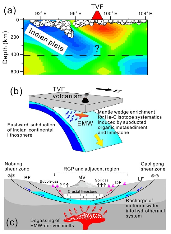 俯冲带火山活动能够将地球深部的碳输送至大气圈,并已成为深部碳循环机制与规模研究的重要对象。长期以来,国内外学者针对大洋俯冲带开展了大量的火山区温室气体释放通量与成因方面的研究工作。然而,关于大陆岩石圈俯冲过程导致的火山活动与深部碳排放的研究却鲜有报道。青藏高原东南部的腾冲火山区具有大规模的全新世火山喷发活动和强烈的现今水热活动(图1)。火山岩地球化学研究与地震层析成像研究表明,腾冲火山区具有印度大陆岩石圈俯冲的地球动力学背景,使其成为研究大陆俯冲带火山区温室气体释放通量与成因的理想地区。