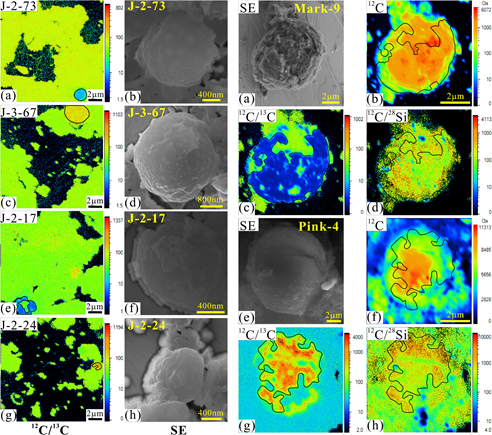 1 NanoSIMS对富碳分选物进行同位素图像分析,发现同位素极为异常的太阳系外石墨颗粒(左侧);对挑选的球状石墨颗粒进行NanoSIMS分析,确认部分颗粒的同位素组成表现为太阳系外颗粒(右侧)