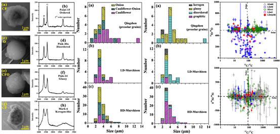 他们根据这些太阳系外石墨颗粒的COSi等同位素组成,确认其源区包括超新星、AGB星等。它们在形貌、结晶程度上有一定相关性,如绝大多数颗粒表现为花椰菜型(Cauliflower)形貌和较高的IntD/IntG值(即结晶程度较低),可能反映了不同恒星来源的石墨颗粒形成条件的差异。通过与碳质球粒陨石中相同密度的太阳系外石墨颗粒进行对比,发现它们在形貌、结晶程度、以及COSi等同位素组成上都十分相似,表明太阳系外石墨颗粒在太阳星云中的分布可能是均匀的。