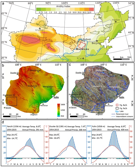 毛乌素沙地位于东亚季风区边缘,地处干旱区和半干旱区的分界线上(图1、图2),这种特殊的位置使得它成为沙漠化研究的宠儿。过去的几十年,很多学者一直都在争论其沙漠化过程的主导因素。前人一般通过统计时间序列上沙漠化面积变化、气候指标和人为因素的对应关系来论证这里沙漠化的控制因素。但是沙漠化面积统计的准确程度、沙漠化过程对外部驱动响应的滞后性以及社会经济数据和自然地理数据的协调使用等问题使得这种研究结果有较多的不确定性。
