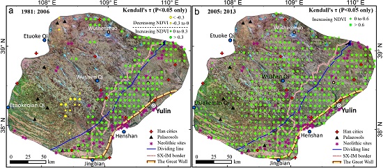 图3 毛乌素植被变化及古遗迹分布 (绿色圆点表示植被显著好转)