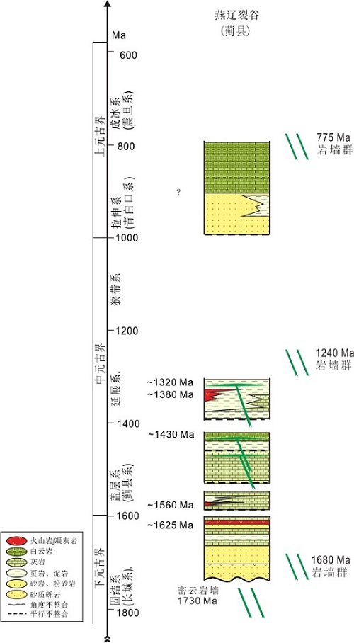 图1 燕辽裂谷中新元古代地层简图及相关岩墙
