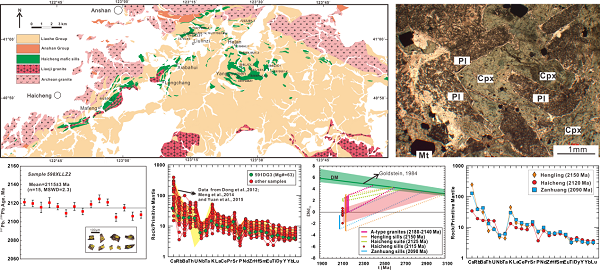 中科院800彩票岩石圈演化国家重点实验室博士研究生王欣平在其导师彭澎研究员的指导下,对海城地区出露的基性岩床进行了系统的野外地质考察,岩相学观察,地球化学和地质年代学工作(图1),并取得了以下进展:1. 通过详细的野外工作,确定这一地区相关基性岩原始产状为岩床,厚度多超过100 m,广泛发育于辽河群中下部层位;2. 通过斜锆石分选,高精度年代学测定,确定海城岩床形成于~21.2亿年前;3. 基性岩床具有拉斑玄武岩特征,岩浆分异由斜长石和单斜辉石主导,形成过程还经历了海水蚀变和较低程度的围岩混染;4. 基性岩床原始岩浆没有新生地壳物质混染迹象,其源区为陆下岩石圈地幔,该岩石圈地幔形成于太古宙。综合分析表明,这些岩浆岩与边缘过程无关,形成于克拉通内,是陆内裂谷的产物;同时,海城基性岩床与华北其他地区同时期岩浆活动可能形成于类似的构造背景。