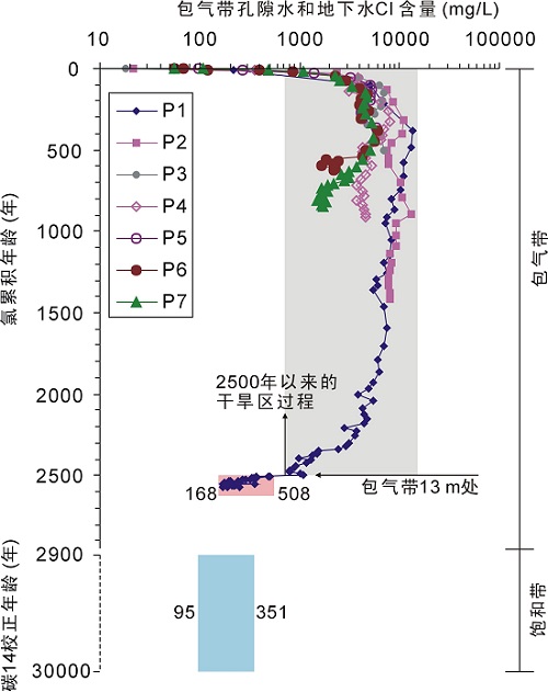 中科院800彩票工程地质与水资源研究室黄天明副研究员、庞忠和研究员、牛津大学水资源研究中心原主任Mike Edmunds教授等人,将包气带和饱和带结合起来,利用多种环境示踪剂综合评价了鄂尔多斯西部某草原带过去3万年以来古水文情势。他们通过研究包气带(剖面最深21 m)和地下水,基于氯质量平衡原理得出现今平均补给量为0.110.32 mm/yr,包气带13 m以浅土壤水氯含量在28427856 mg/L,代表了近2500年的累积补给;而潜水(埋深3070 m)是2900年以前补给的(14C校正年龄在432729708年),氯含量为95351 mg/L(图1),显著区别于包气带浅部氯含量。这显示了近2500年以来的干旱化过程,该结果与西北干旱区的湖泊沉积记录等得出的结果相吻合。此外,研究发现,现今的水文过程与浅层地下水远未达到平衡,他们认为在干旱区地下水补给的研究中应得到重视。