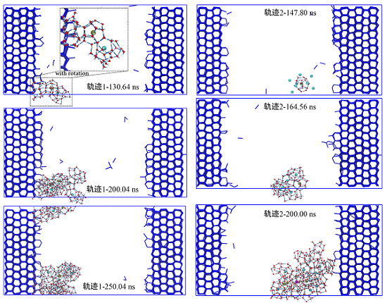 图1:甲烷水合物既可以在冰表面发生异相成核(轨迹1),也可以在溶液相中发生均相成核(轨迹2)。冰显示为蓝色;水合物中氧原子和氢原子分别显示为红色和白色;甲烷显示为黄褐色(位于512笼子中)和青色(位于其他笼子中)