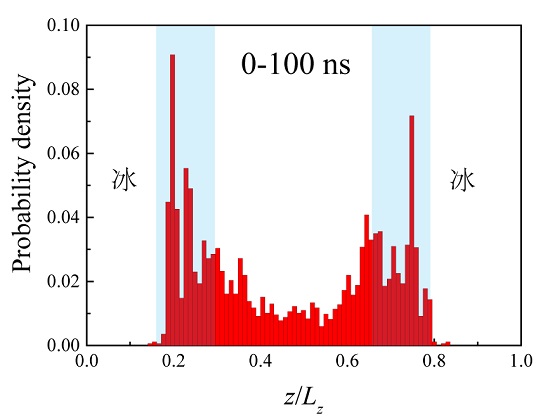 图2:在成核诱导期,沿着z轴方向水合物笼子密度的概率分布,淡蓝色区域为冰/溶液界面