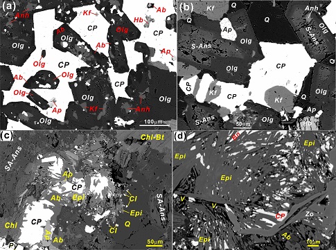 近期他们在中亚斑岩铜矿带新疆东准噶尔琼河坝斑岩铜矿区桑南英云闪长岩中发现富铜斑状基性包体,并开展了包体与围岩详细的岩石学、地球化学、年代学、矿石学与成矿作用的研究,结果显示:1.基性包体含有斑状结构、浸染状硫化物和碎裂的堆积斑晶,含有快速结晶形成的细长板状斜长石和针状锆石基质,钾长石、黄铜矿和绿帘石呈交生结构(图1),与主岩有着不同的地球化学成分,但与主岩具相似的形成深度和锆石年龄,为富Cu的镁铁质岩浆滴;2.岩石学与岩石化学特征显示基性包体属于高钾钙碱性闪长质岩浆、形成于正常岛弧背景,而主岩英云闪长岩具埃达克质的特征、可能形成于基性下地壳的部分熔融;3.基性包体多由含磁铁矿的壳和Cu-Fe硫化物核组成,大多数Cu-Fe硫化物呈填隙状分布于基质硅酸盐矿物更长石、钾长石和石英之间、并表现出交生结构(图2a,2b),少量Cu-Fe硫化物分布晶洞中(图2c)、并发育黄铜矿-绿帘石的嵌晶结构(图2d),包体记录了斑岩铜矿系统岩浆结晶与流体析出和沉淀的完整过程。研究指出富铜斑状基性包体岩浆形成于地壳底部岩浆房中的氧化的玄武质岩浆的结晶分异作用(图3)。