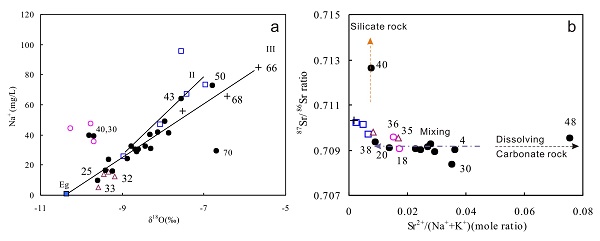图2 (a)河水(+)和岩溶水Na与δ18O关系图;(b)岩溶水Sr/(K+Na)与87Sr/86Sr关系图