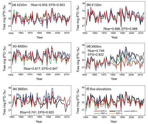 在上述背景下,中科院800彩票新生代地质与环境院重点实验室季风系统演化课题组许晨曦副研究员与中科院地理科学与自然资源研究所的邵雪梅研究员、日本综合地球环境学研究所的中塚武教授开展合作研究,拟采用不同样芯中相对较宽的部分进行拼接,最终形成连续的、较长的同位素序列的方法。由于不同样芯可能采自于树木不同的高度、不同的生长方向、不同海拔的树木以及不同年龄的树木,所以上述方法的实现需要满足一个前提条件:即不同样芯中的氧同位素变化具有一致性且记录了相同的气候信息。为此,他们分析测试了阿尼玛卿山地区同一树木不同高度、不同方向以及不同树木的不同海拔和不同树龄的氧同位素变化,发现祁连圆柏个体内部以及不同个体间的氧同位素变化高度一致,不同海拔的树轮氧同位素的气候意义也具有相同的特征,都表现出与区域5-7月降水呈显著负相关关系。